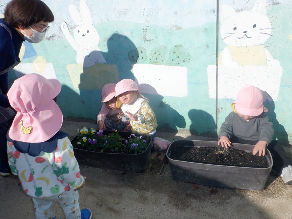 小さいクラスの遊ぶ庭には、お花が仲間入りしました。