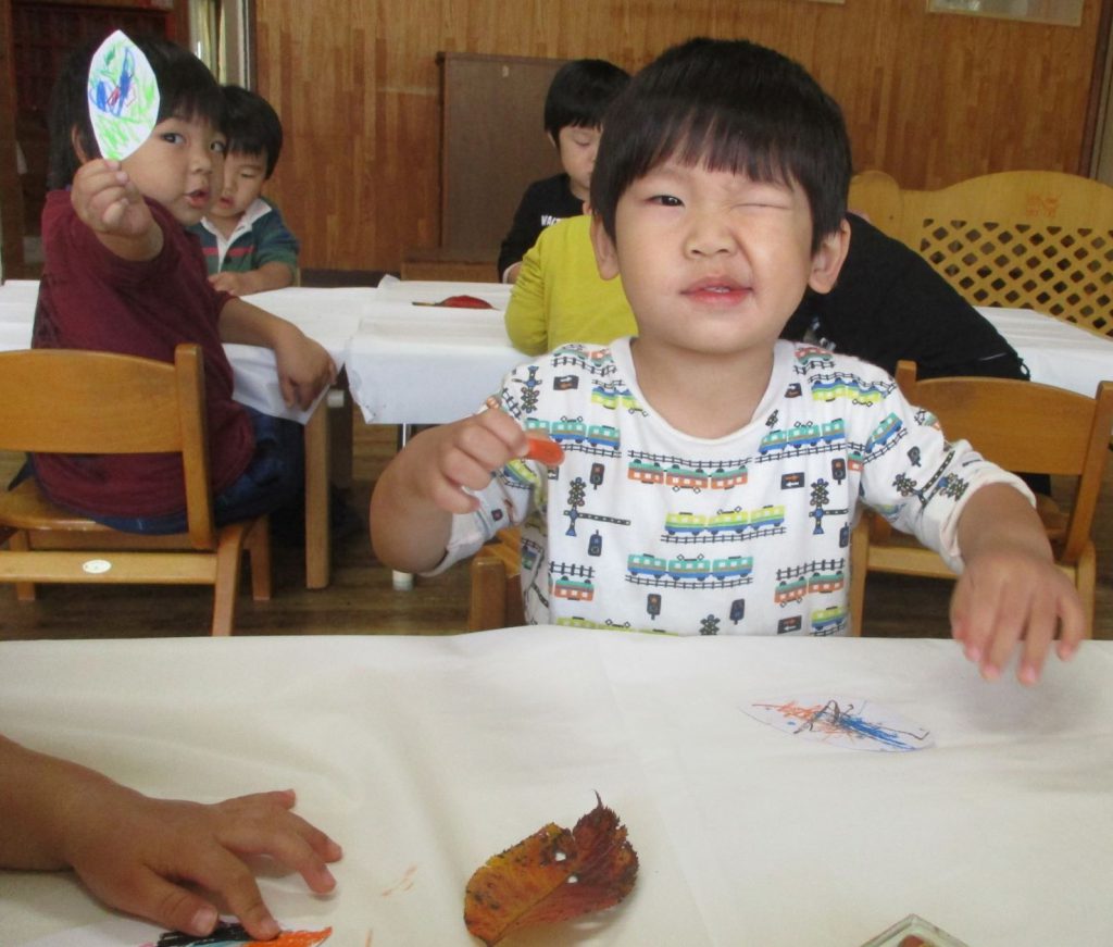 園庭に色とりどりの葉が落ち始めると、色の名前を言いながら楽しそうに集める姿もありました。