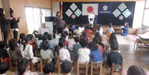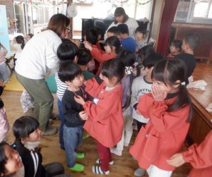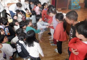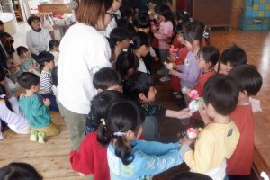 お別れ会では、各クラスが作ったプレゼンを渡しました。あお組はお礼にネックレスを首にかけてあげました。
